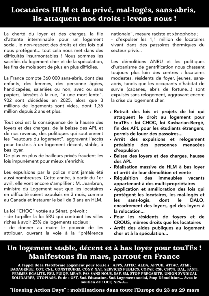 Un logement stable, décent et à bas loyer pour touTEs !Manifestons fin mars, partout en France avant la fin de la trêve hivernale